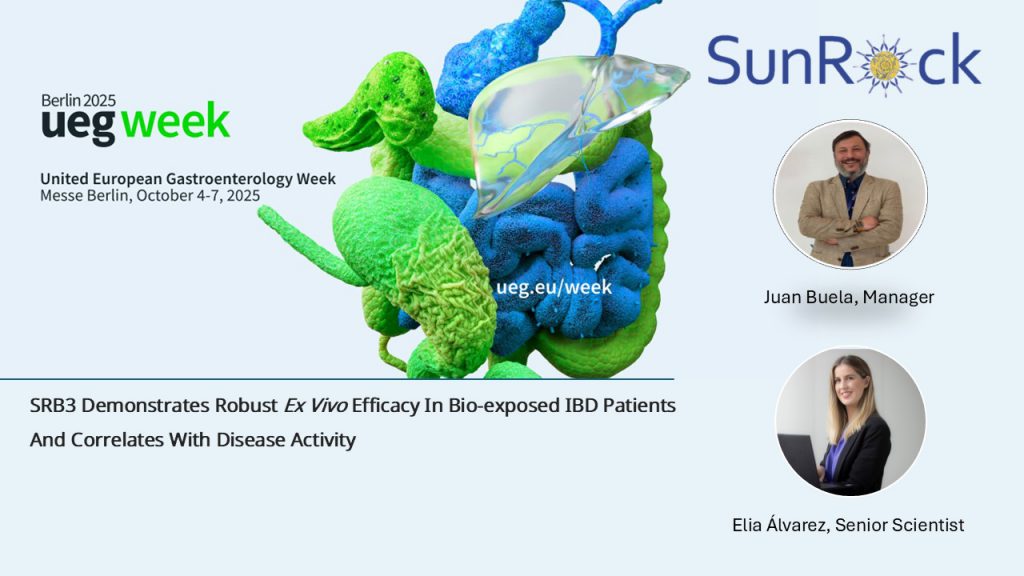 Our Manager, Juan Buela and Elia Alvarez, our Senior Scientist, will be attending UEG Week 2025 in Berlin (October 4–7), and we are pleased to share that we will be presenting a poster entitled: “PP0371: SRB3 DEMONSTRATES ROBUST EX VIVO EFFICACY IN BIO-EXPOSED IBD PATIENTS AND CORRELATES WITH DISEASE ACTIVITY.”